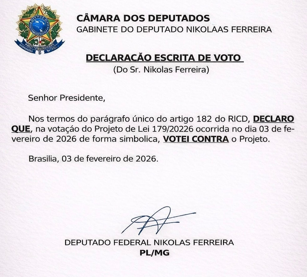Mesmo diante de uma votação simbólica, mecanismo que não registra individualmente o voto dos deputados, Nikolas Ferreira fez questão de declarar formalmente e por escrito seu voto contrário aos projetos que tratavam do tema, demonstrando, mais uma vez, coerência com seus princípios e compromisso com a população brasileira.